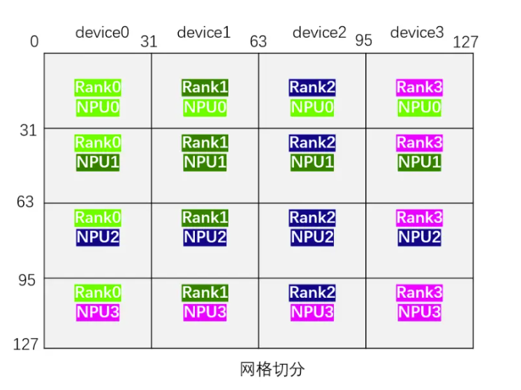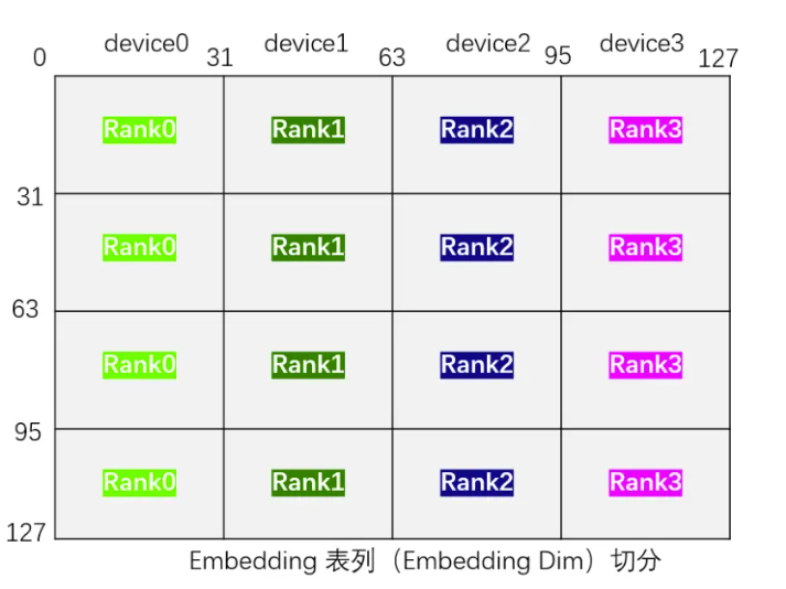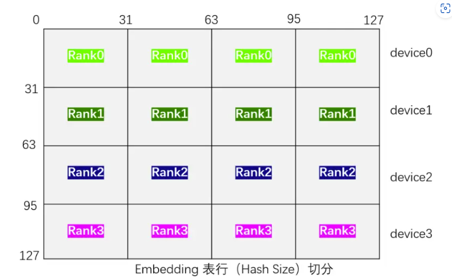 - Column Wise****切分:表示将Embedding 表按列(Embedding Dim)切分到不同的Rank上,一个Embedding Dim维度为128均分切到4张卡上变成[0~31, 32~63,64~95,96~127]。也就是每一个Rank分别获取每个特征的{[0, 31],[32, 63], [64, 95], [96, 127]}。注意:图中上方的Device一般指的是不同的服务器,也可根据表的大小与需要进行设置到同一个Device。