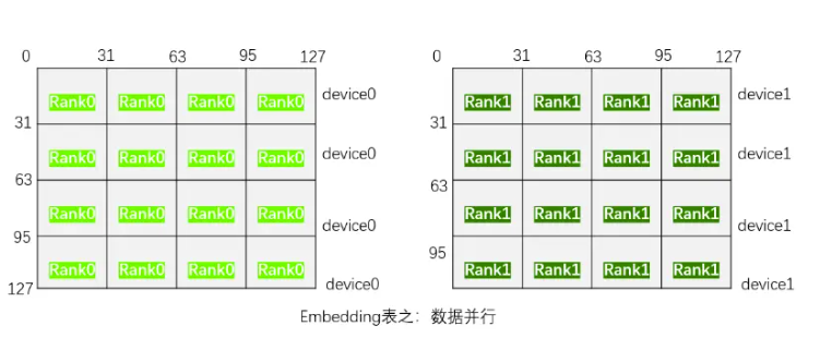 4:数据并行并行之Embedding表:数据并行表示每个Rank中都保留整个表的副本。