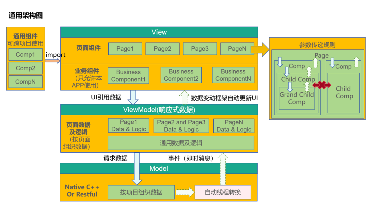 MVVM架构,M就是model层,是应用的原始数据提供者,负责存储和管理应用的数据以及业务逻辑,不直接与用户界面交互;view层就是我们的页面组件,业务组件,通用组件,凡是UI绘制的就是我们的view层,比如页面组件中的登录页,列表页,编辑页等等,每个页对应需要的数据可能是完全不一样的,也可能多个页面需要的数据是同一套,主要负责用户界面展示数据并与用户交互,不包含任何业务逻辑。viewModel层,其实就是view和model层的纽带,负责管理UI状态和交互逻辑,通常一个View对应一个ViewModel,ViewModel监控Model数据的变化,通知View更新UI,同时处理用户交互事件并转换为数据操作。