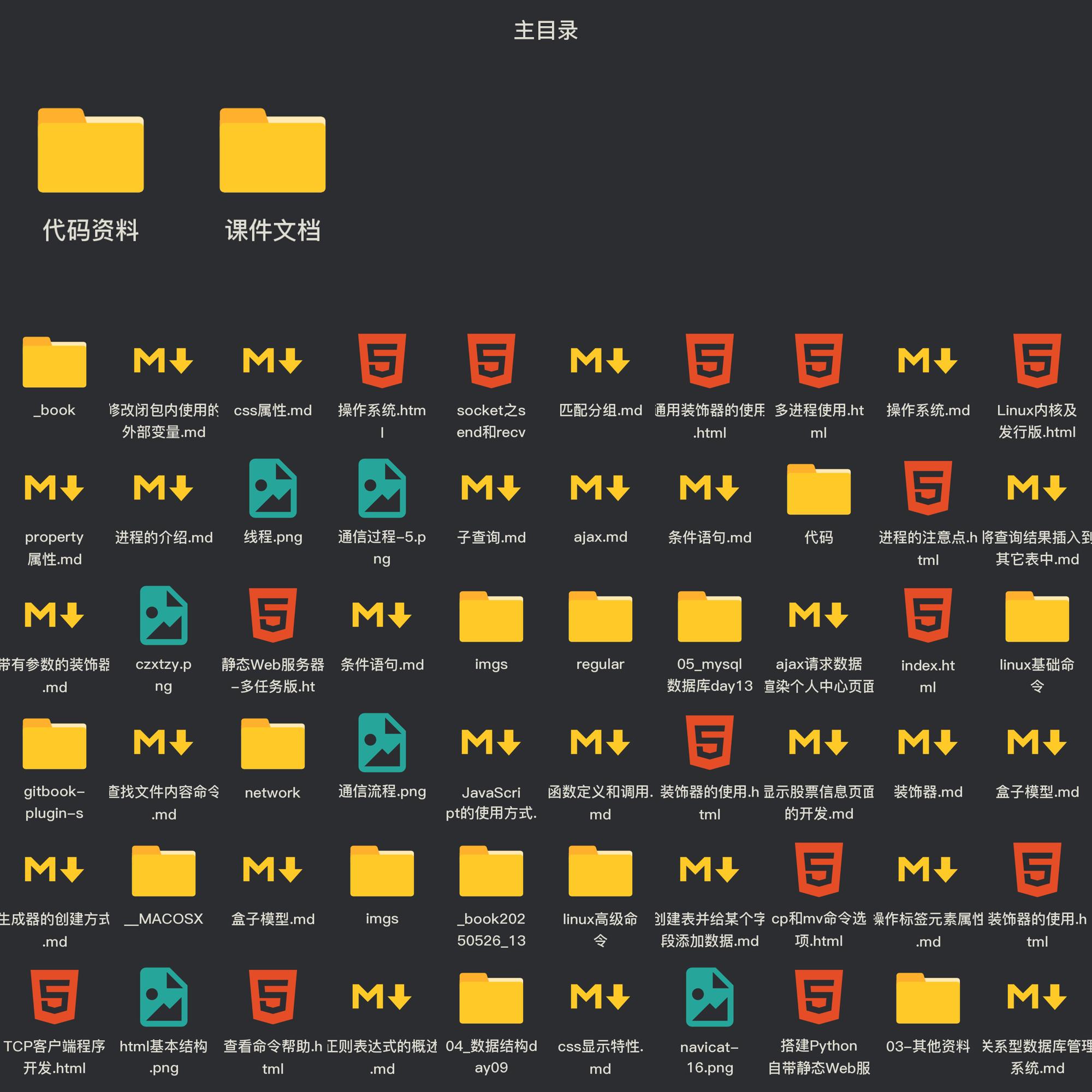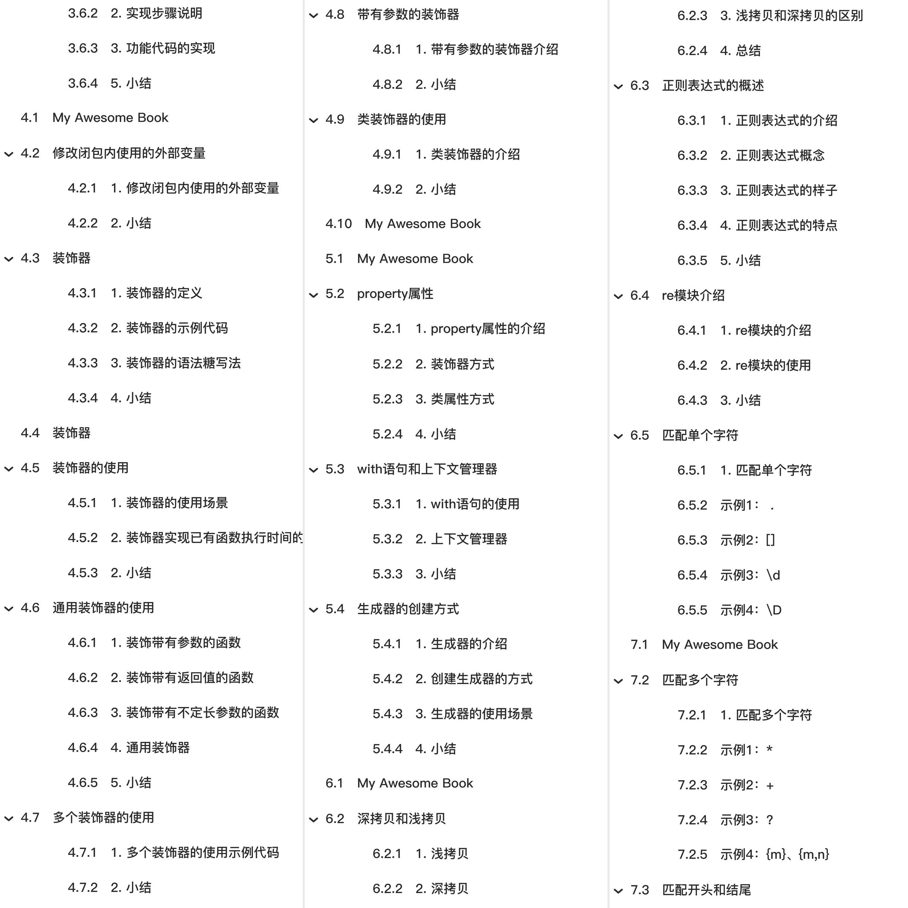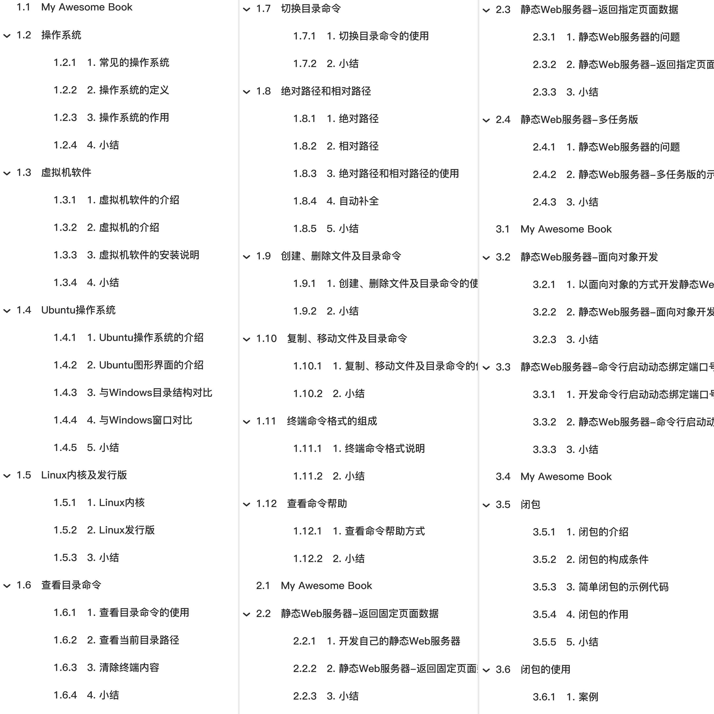 教程总体简介:My Awesome Book 操作系统 1. 常见的操作系统 2. 操作系统的定义 4. 小结 虚拟机软件 1. 虚拟机软件的介绍 Ubuntu操作系统 2. Ubuntu图形界面的介绍 3. 与Windows目录结构对比 Linux内核及发行版 1. Linux内核 查看目录命令 1. 查看目录命令的使用 2. 查看当前目录路径 3. 清除终端内容 绝对路径和相对路径 1. 绝对路径 4. 自动补全 创建、删除文件及目录命令 终端命令格式的组成 1. 终端命令格式说明 查看命令帮助 静态Web服务器-返回固定页面数据 1. 开发自己的静态Web服务器 静态Web服务器-命令行启动动态绑定端口号 1. 开发命令行启动动态绑定端口号的静态web服务器 闭包 2. 闭包的构成条件 3. 简单闭包的示例代码 4. 闭包的作用 闭包的使用 1. 案例 2. 实现步骤说明 3. 功能代码的实现 修改闭包内使用的外部变量 装饰器 1. 装饰器的定义 3. 装饰器的语法糖写法 装饰器的使用 2. 装饰器实现已有函数执行时间的统计 带有参数的装饰器 property属性 3. 类属性方式 with语句和上下文管理器 1. with语句的使用 2. 上下文管理器 生成器的创建方式 2. 创建生成器的方式 3. 生成器的使用场景 深拷贝和浅拷贝 1. 浅拷贝 3. 浅拷贝和深拷贝的区别 正则表达式的概述 2. 正则表达式概念 re模块介绍 2. re模块的使用 匹配单个字符 示例1: . 示例2:[] 示例3:\d 小结 匹配开头和结尾 示例3:^ 和 $ 2.除了指定字符以外都匹配 4. 课下练习 匹配分组 1. 匹配分组相关正则表达式 示例4:(?P<name>) (?P=name) ls命令选项 mkdir和rm命令选项 1. mkdir命令选项 2. rm命令选项 cp和mv命令选项 重定向命令 查看文件内容命令 链接命令 2. 软链接 5. 硬链接小结 文本搜索命令 3. grep命令结合正则表达式的使用 压缩和解压缩命令 2. tar命令及选项的使用 3. zip和unzip命令及选项的使用 文件权限命令 1. chmod命令的介绍 获取管理员权限的相关命令 2. whoami命令的使用 5. passwd命令的使用 用户相关操作 1. 创建用户 2. 设置密码 远程登录、远程拷贝命令 3. FileZilla软件的使用 编辑器 vim 2. vim 的工作模式 软件安装 2. deb文件格式安装 3. apt-get方式安装 4. 更改镜像源 软件卸载 多任务的介绍 2. 多任务的概念 进程 多进程的使用 1 导入进程包 2. Process进程类的说明 3. 多进程完成多任务的代码 获取进程编号 1. 获取进程编号的目的 3. 获取当前父进程编号 进程执行带有参数的任务 3. kwargs参数的使用 进程的注意点 2. 进程之间不共享全局变量 4. 主进程会等待所有的子进程执行结束再结束 线程 互斥锁 1.互斥锁的概念 4. 使用互斥锁完成2个线程对同一个全局变量各加100万次的操作 死锁 2. 死锁示例 3. 避免死锁 进程和线程的对比 1. 进程和线程的对比的三个方向 2. 关系对比 3. 优缺点对比 协程 协程是啥 协程的优点 gevent 安装 1. gevent的使用 3. 给程序打补丁 IP 地址的介绍 2. IP 地址的表现形式 3. 查看 IP 地址 4. 检查网络是否正常 端口和端口号的介绍 1. 问题思考 2. 什么是端口 5. 端口号的分类 TCP 的介绍 1. 网络应用程序之间的通信流程 3. TCP 的特点 socket 的介绍 4. socket 使用场景 TCP 网络应用程序开发流程 2. TCP 客户端程序开发流程的介绍 TCP服务端程序开发 1. 开发 TCP 服务端程序开发步骤回顾 socket之send和recv原理剖析 1. 认识TCP socket的发送和接收缓冲区 2. send原理剖析 HTTP 协议 3. 浏览器访问web服务器的通信过程 URL 2. URL的组成 查看HTTP协议的通信过程 1. 谷歌浏览器开发者工具的使用 HTTP响应报文 2. HTTP 状态码介绍 搭建Python自带静态Web服务器 1. 静态Web服务器是什么?