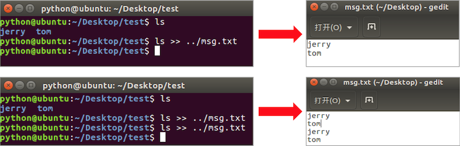 - 终端内容保存到文件使用重定向有两种方式: > 和 >>