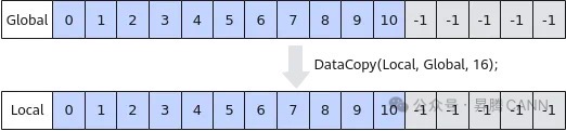 非对齐搬入:当需要从Global拷贝11个half数值到Local时,为保证搬运的数据长度32字节对齐,使用DataCopy拷贝16个half(32B)数据到Local上,Local[11]~Local[15]被设置成无效数据-1。下文描述中的Global指Global Memory上的tensor,Local指Local Memory上的tensor。