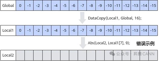a.使用DataCopy从GLobal搬运16个half数据到Local1中,包含冗余数据-11~-15;