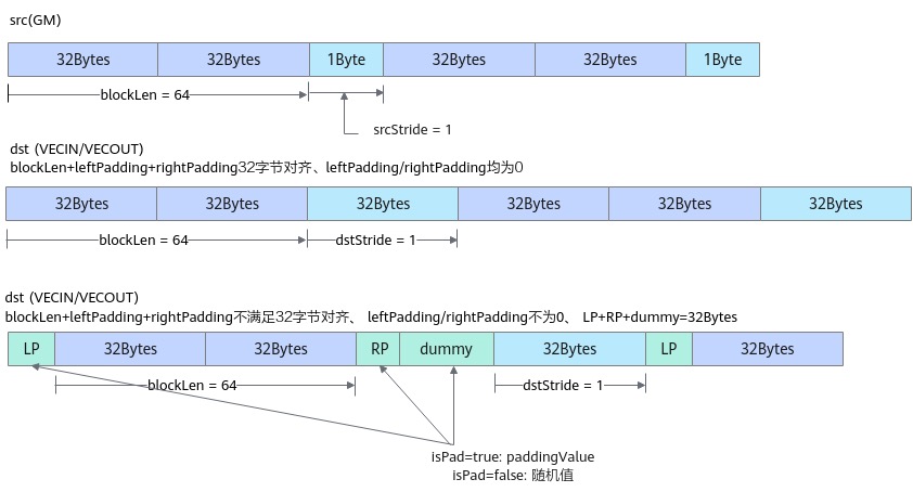 blockLen+leftPadding+rightPadding不满足32字节对齐时,框架会填充一些假数据dummy,保证填充后的数据(左右填充的数据+blockLen+假数据)为32字节对齐。leftPadding/rightPadding不为0:若isPad为false,左右两侧填充的数据值和dummy值均为随机值;否则为paddingValue。
