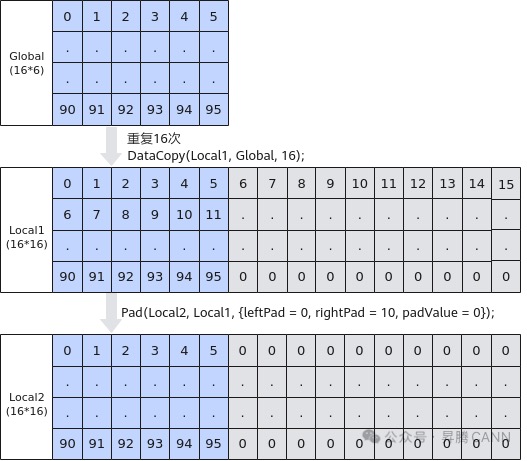 如下图所示,假设输入数据的shape为16 * 6,搬入Local后大小为16 * 16,每行都包含冗余数据,逐行清零性能较差,可以使用Pad一次性清零,步骤为: