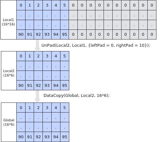 如下图所示,Local内存大小为16*16,每行中只有前6个数为有效数据, 要搬出的有效数据16 * 6满足32B对齐,可以使用UnPad接口去除冗余数据并完整搬出。步骤如下: