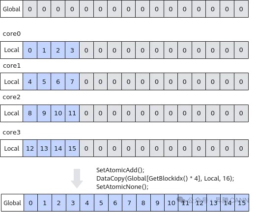 如下图所示,有4个核参与计算,每个核拷贝出4个数,每个核上拷贝的数据长度不满足32字节对齐,采用将冗余数据一起搬出的方式,步骤如下: