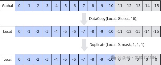 b.使用基础API Duplicate,按照如下方式设置mask值,控制仅后5个元素位置有效,将冗余数据填充为0。