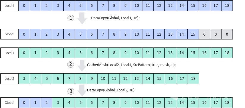 b.使用GatherMask接口,将Local1[3]~[18]的数Gather到Local2中,Local2从对齐地址开始;