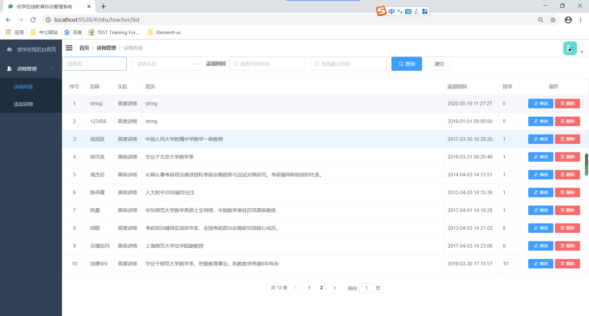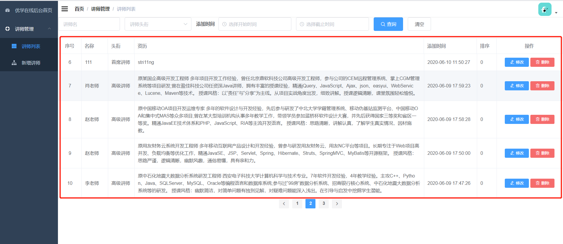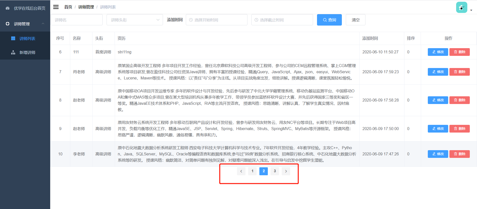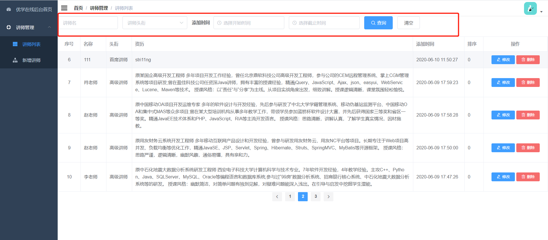 <!--查询表单--> <el-form :inline="true" class="demo-form-inline"> <el-form-item> <el-input v-model="searchObj.name" placeholder="讲师名"/> </el-form-item> <el-form-item> <el-select v-model="searchObj.level" clearable placeholder="讲师头衔"> <el-option :value="1" label="高级讲师"/> <el-option :value="2" label="首席讲师"/> </el-select> </el-form-item> <el-form-item label="添加时间"> <el-date-picker v-model="searchObj.begin" type="datetime" placeholder="选择开始时间" value-format="yyyy-MM-dd HH:mm:ss" default-time="00:00:00" /> </el-form-item> <el-form-item> <el-date-picker v-model="searchObj.end" type="datetime" placeholder="选择截止时间" value-format="yyyy-MM-dd HH:mm:ss" default-time="00:00:00" /> </el-form-item> <el-button type="primary" icon="el-icon-search" @click="fetchData()">查询</el-button> <el-button type="default" @click="resetData()">清空</el-button> </el-form> |