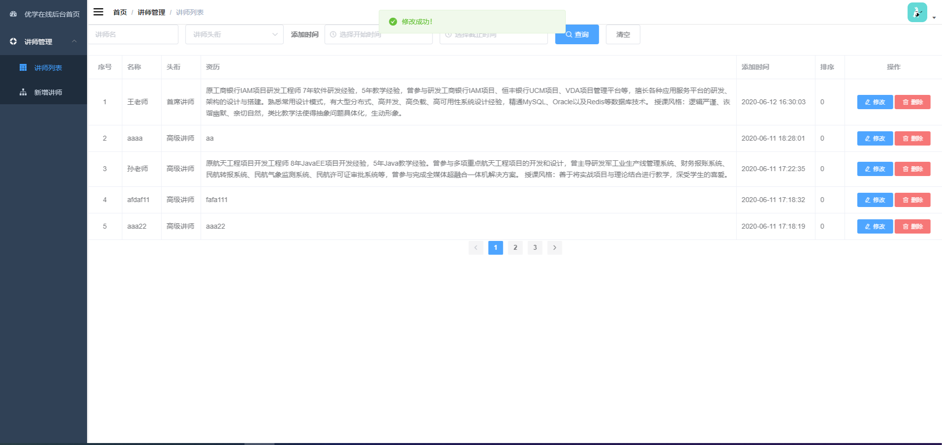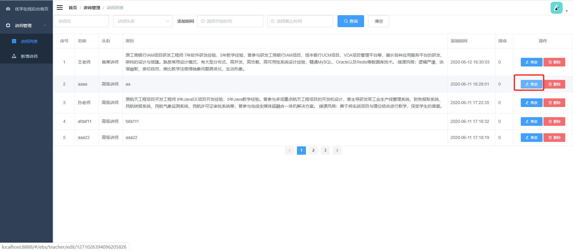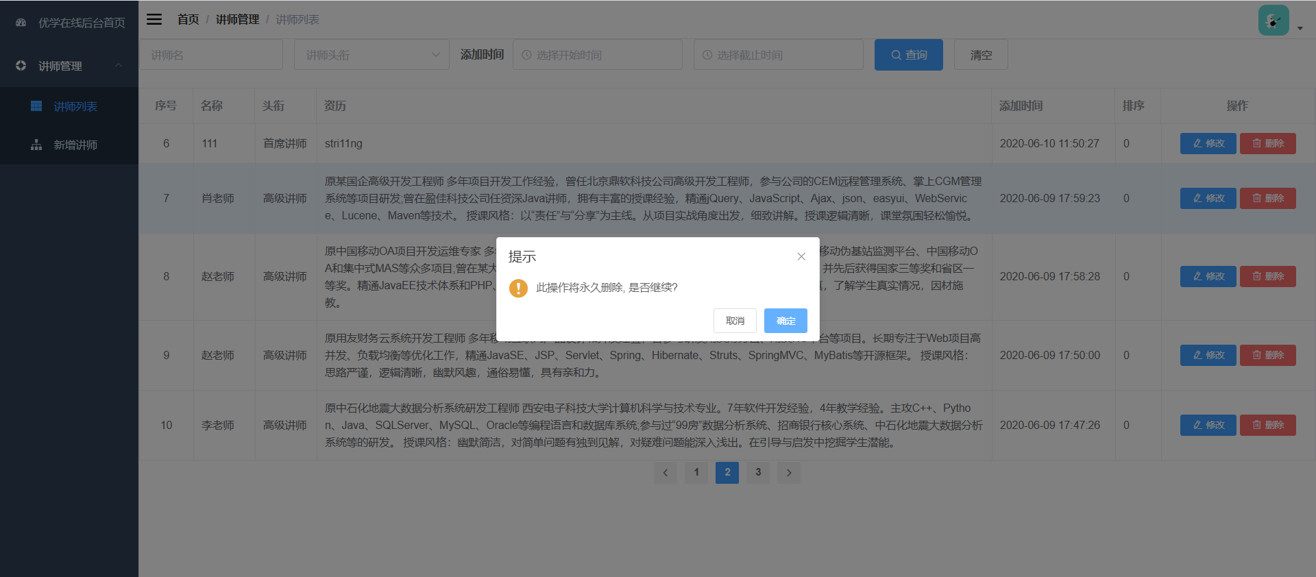 <!-- 表格 --> <el-table v-loading="listLoading" :data="list" element-loading-text="数据加载中" border fit highlight-current-row> <el-table-column label="序号" width="70" align="center"> <template slot-scope="scope"> {{ (page - 1) * limit + scope.$index + 1 }} </template> </el-table-column> <el-table-column prop="name" label="名称" width="80" /> <el-table-column label="头衔" width="80"> <template slot-scope="scope"> {{ scope.row.level===1?'高级讲师':'首席讲师' }} </template> </el-table-column> <el-table-column prop="intro" label="资历" /> <el-table-column prop="gmtCreate" label="添加时间" width="160"/> <el-table-column prop="sort" label="排序" width="60" /> <el-table-column label="操作" width="200" align="center"> <template slot-scope="scope"> <router-link :to="'/edu/teacher/edit/'+scope.row.id"> <el-button type="primary" size="mini" icon="el-icon-edit">修改</el-button> </router-link> <el-button type="danger" size="mini" icon="el-icon-delete" @click="removeDataById(scope.row.id)">删除</el-button> </template> </el-table-column> </el-table> |