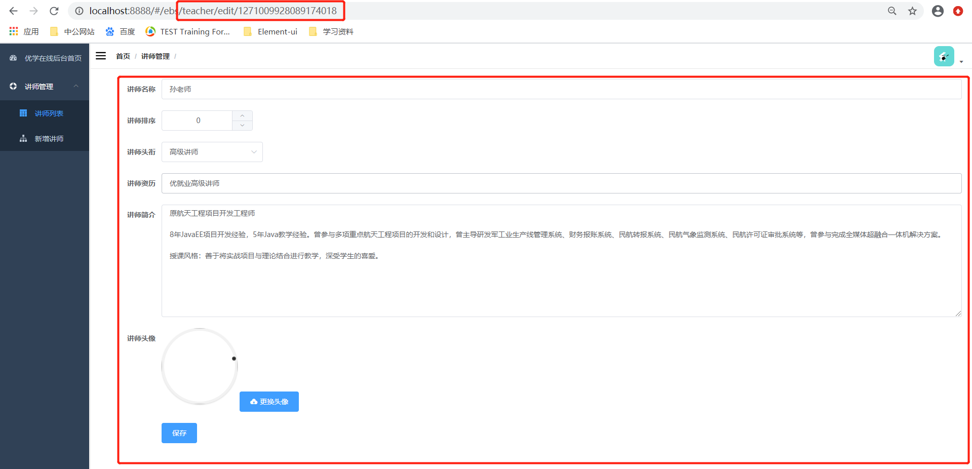 <template> <div class="app-container"> <el-form label-width="120px"> <el-form-item label="讲师名称"> <el-input v-model="teacher.name"/> </el-form-item> <el-form-item label="讲师排序"> <el-input-number v-model="teacher.sort" controls-position="right" min="0"/> </el-form-item> <el-form-item label="讲师头衔"> <el-select v-model="teacher.level" clearable placeholder="请选择"> <!-- 数据类型一定要和取出的json中的一致,否则没法回填 因此,这里value使用动态绑定的值,保证其数据类型是number --> <el-option :value="1" label="高级讲师"/> <el-option :value="2" label="首席讲师"/> </el-select> </el-form-item> <el-form-item label="讲师资历"> <el-input v-model="teacher.career"/> </el-form-item> <el-form-item label="讲师简介"> <el-input v-model="teacher.intro" :rows="10" type="textarea"/> </el-form-item> <!-- 讲师头像:TODO --> <el-form-item> <el-button :disabled="saveBtnDisabled" type="primary" @click="saveOrUpdate">保存</el-button> </el-form-item> </el-form> </div> </template> |