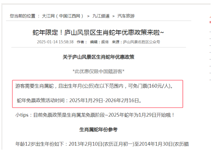 庐山风景区:2025年1月29日至2026年2月16日,属蛇游客可免门票(160元/人),需携带身份证到人工售票窗口登记换票。