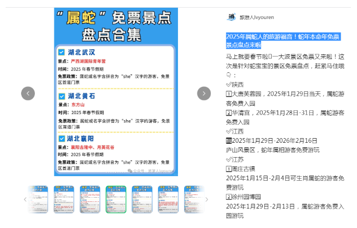 除了在官方网站和权威网站上发布免票信息,我们也可以在一些旅游博主的微信公众号上找到整理好的免票或者限定优惠的景点信息。比如微信公众号“旅游人lvyouren”发布的“2025年属蛇人的旅游福音!蛇年本命年免票景点盘点来啦”就展示得非常详细。