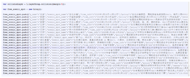 根据互联网提供的基础数据,我们将蛇年免票的景点进行了汇总,形成了以下的景点数组数据,如下图所示: