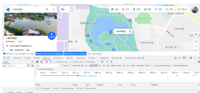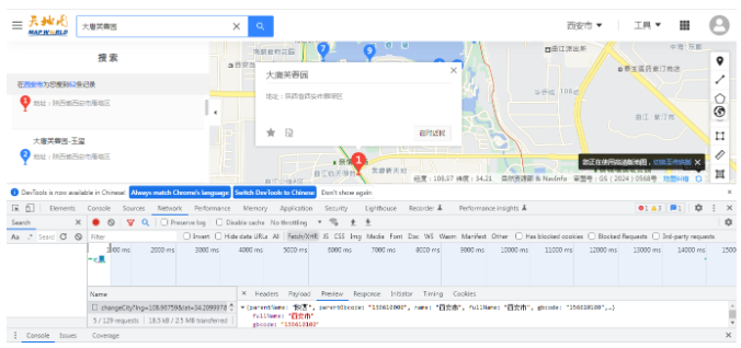 前面已经将各个优惠景点的数据进行了数组组织,对于拿到的文本数据,怎么将这些景点转成对应的空间信息呢?这里分享几个方法。第一中方法就是找一个地图应用,比如百度或者高德,然后找到它的搜索界面,在搜索界面中输入我们目标的景点,然后点击详情,在详情的页面打开网页监控,这样就能找到实际的请求地址,之前我们分享过百度地图或者高德地图的AOI或者POI的信息地址。