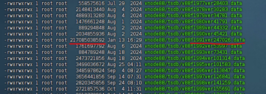 经过检查文件编号和更新日期,发现某单个数据文件大小和写入日期异常,可以判断是应用侧写入了大量历史数据,导致存储放大。