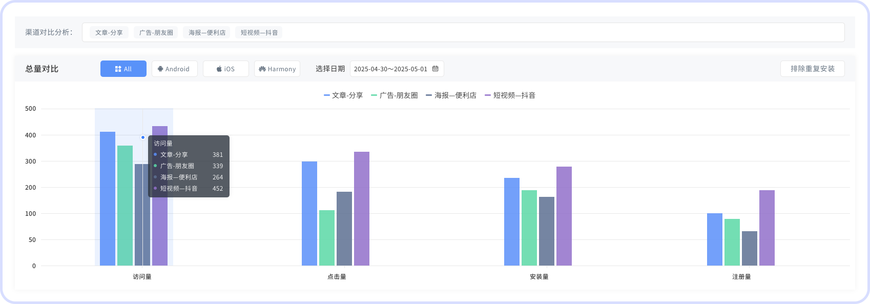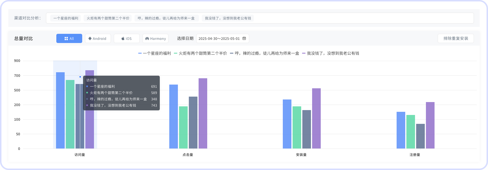 (1)先从openinstall【渠道对比分析】中自定义你想分析的渠道。