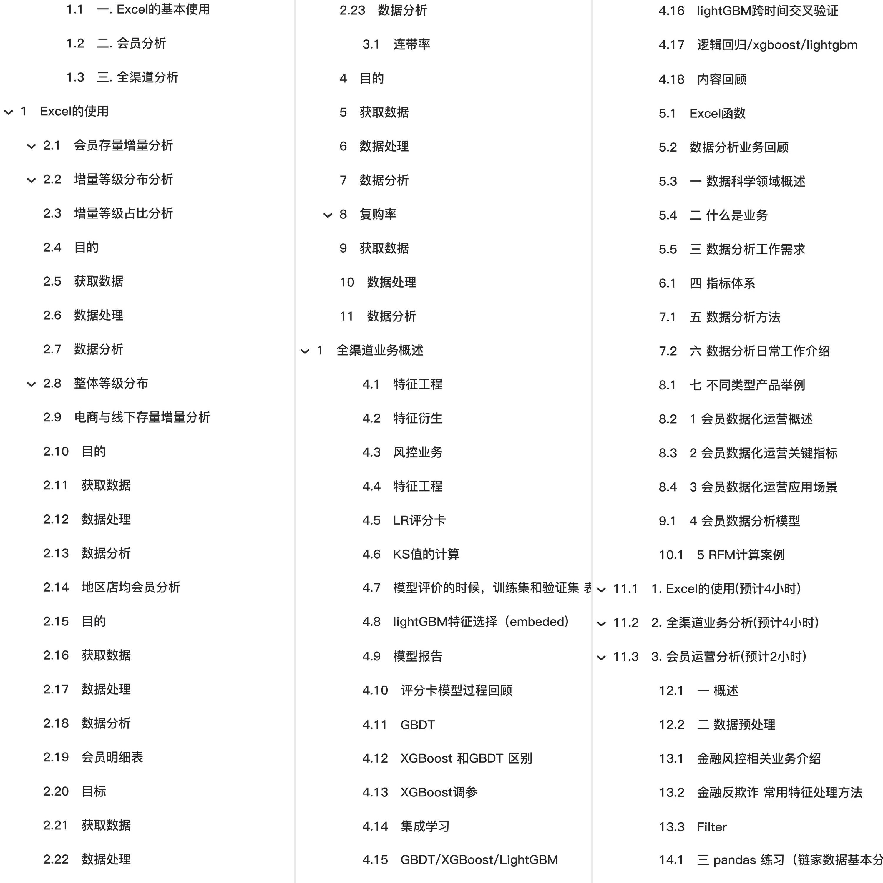 教程总体简介:Excel的使用 全渠道业务概述 1. Excel的使用(预计4小时) 2. 全渠道业务分析(预计4小时) 第01章 Pandas基础 第02章 DataFrame基本操作 第03章 数据分析入门 第04章 选取数据子集 第05章 布尔索引 第06章 分组聚合、过滤、转换 第09章 时间序列分析 第10章 用Matplotlib、Pandas、Seaborn进行可视化