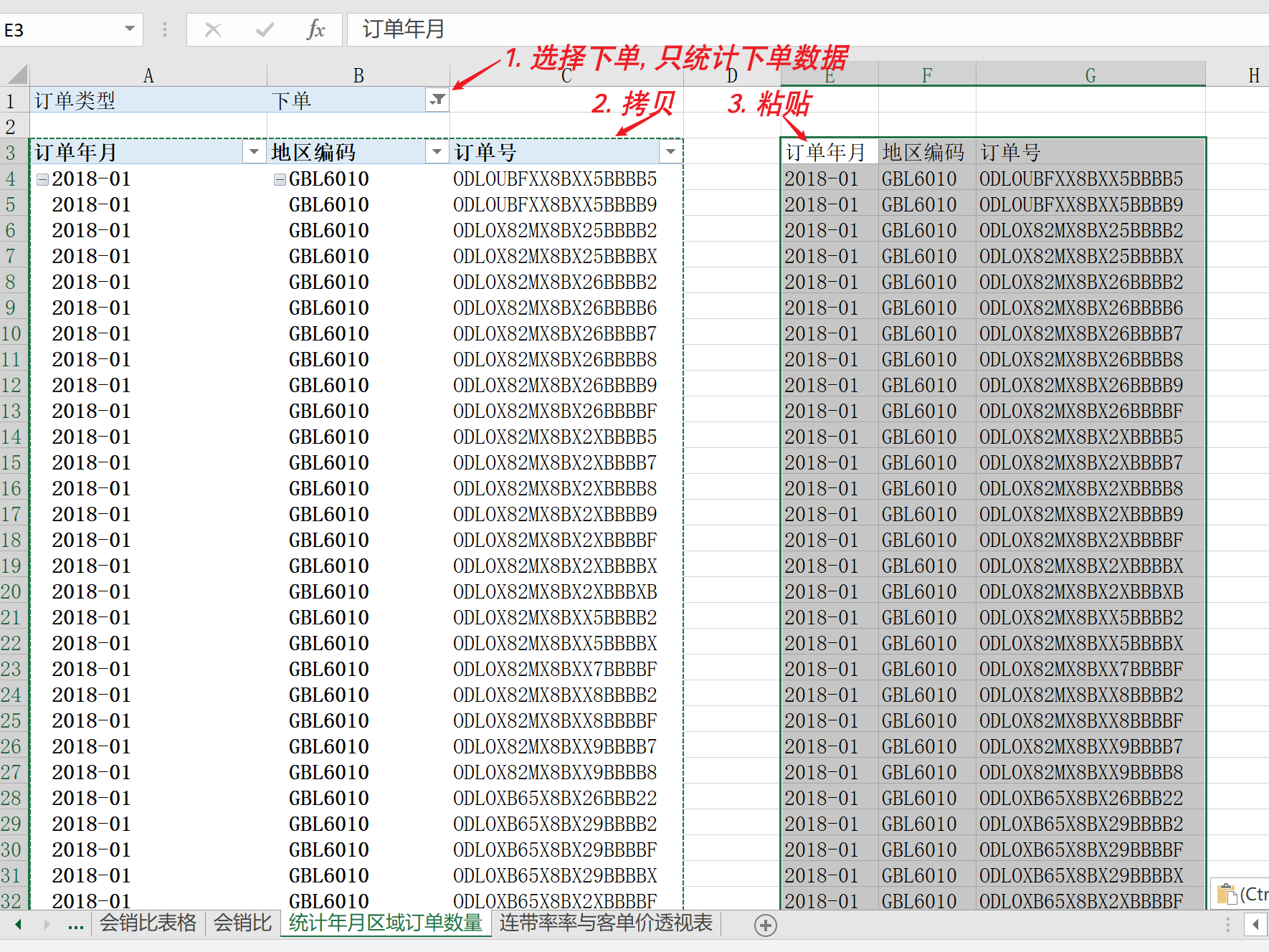 - 合并数据: 拷贝 订单的数量,消费数量,消费金额 到新工作表