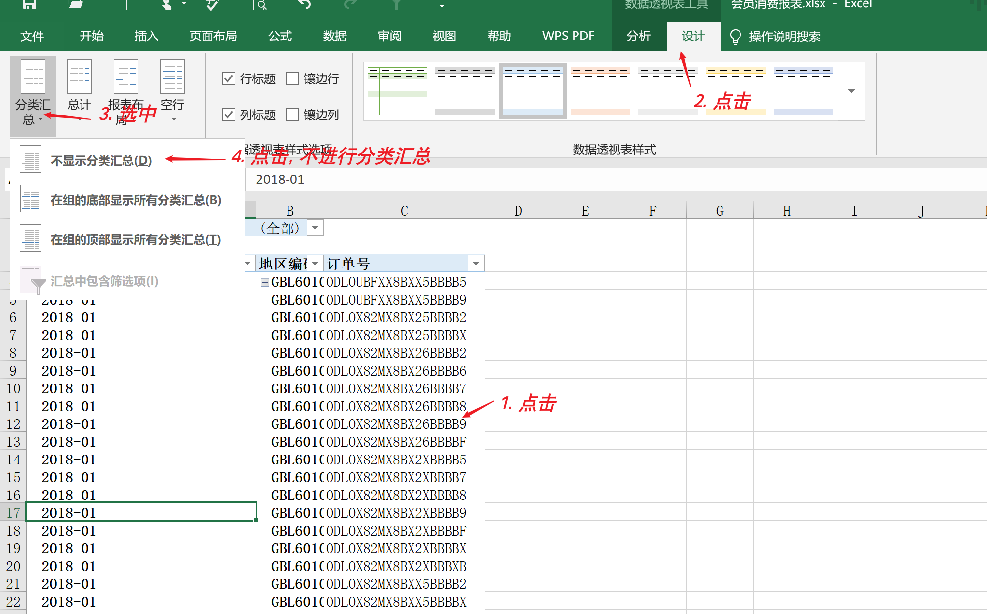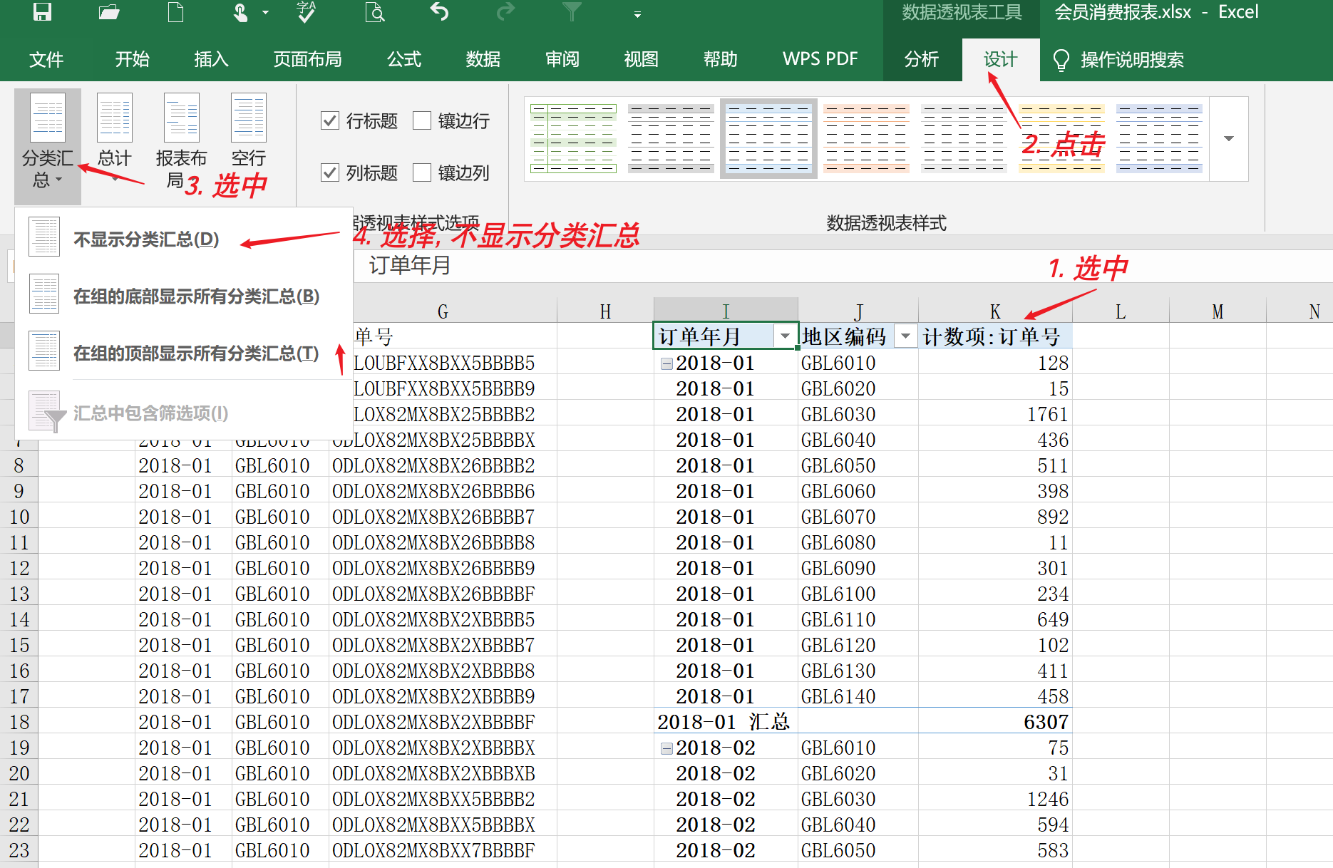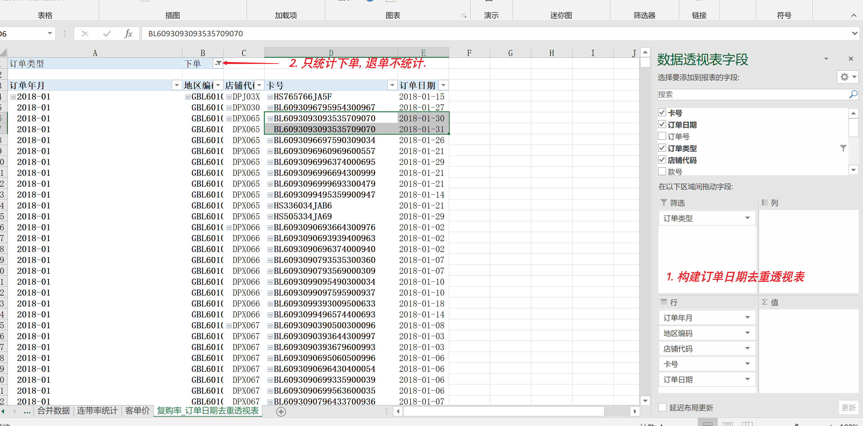 由于 一个会员同一天消费多次也算一次消费,所以会员消费次数按一天一次计算, 所有需要通过透视表, 对订单日期进行去重
