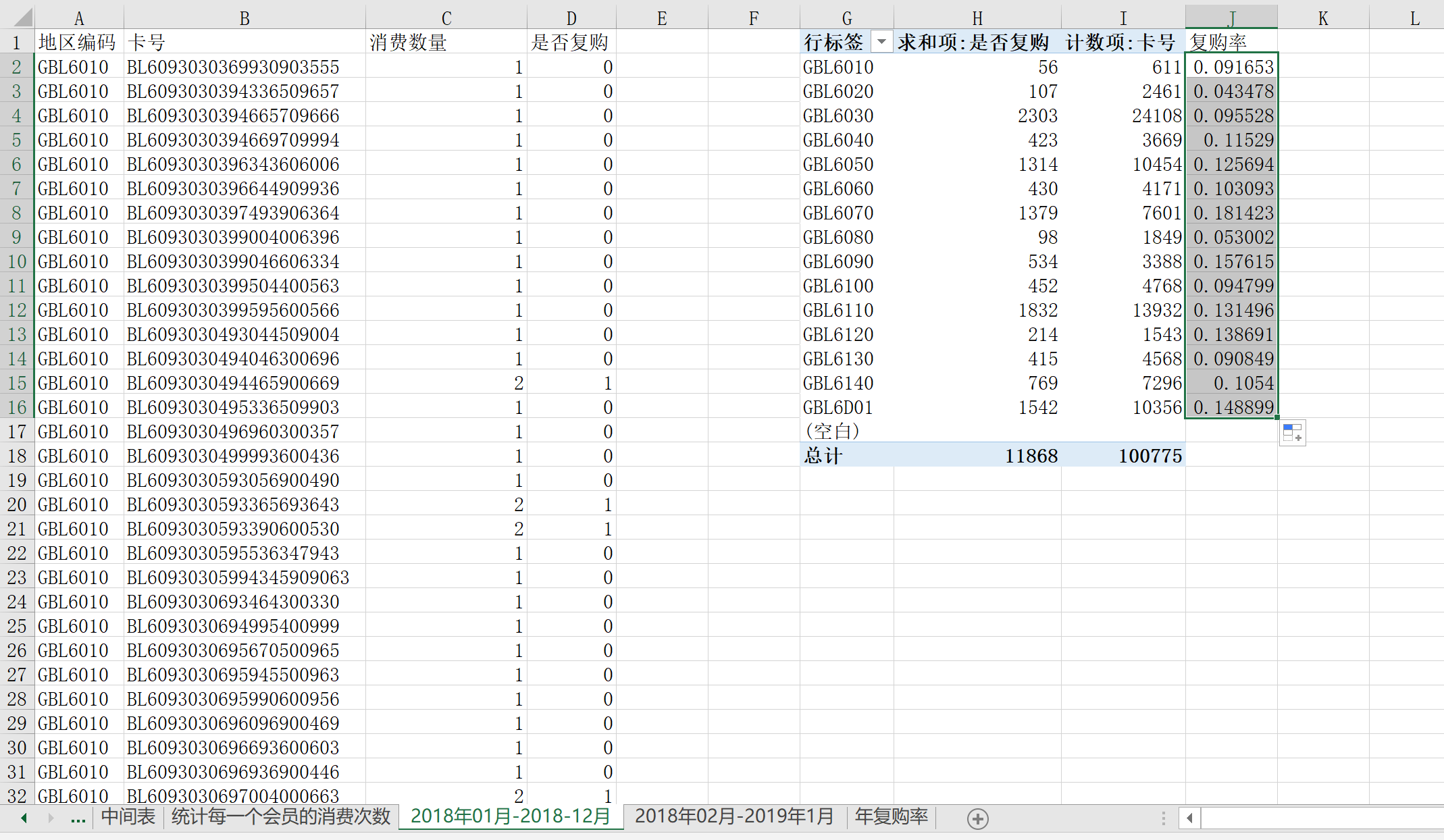 拷贝2018年01月~2018年12月会员消费次数与是否复购到新工作表中