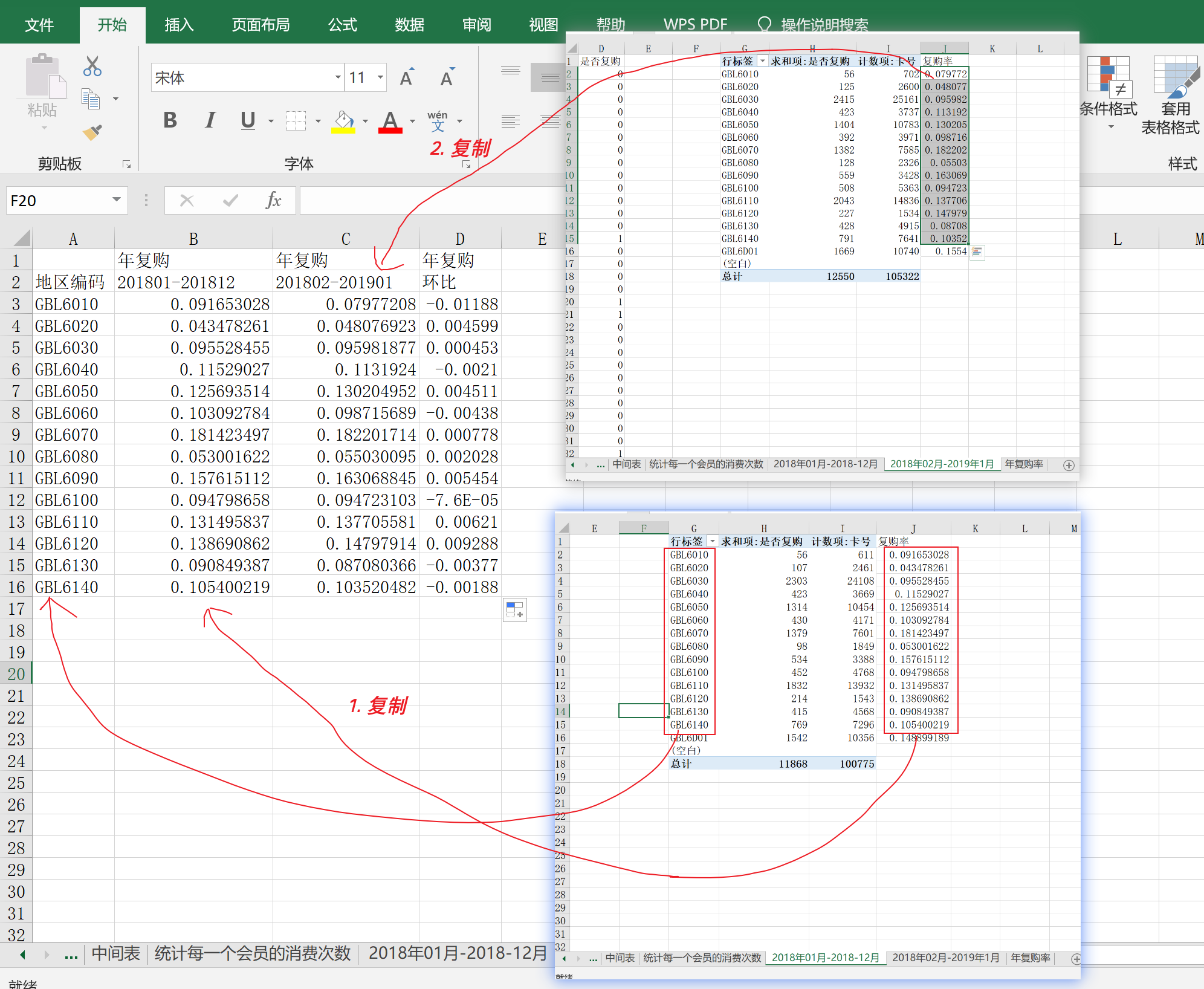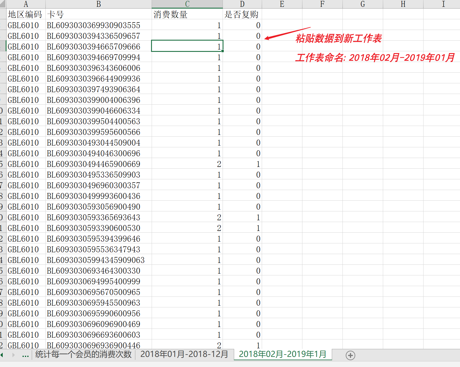 拷贝2018年02月~2019年01月会员消费次数与是否复购到新工作表中