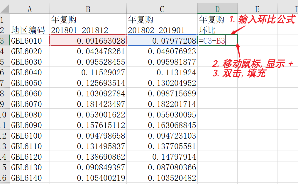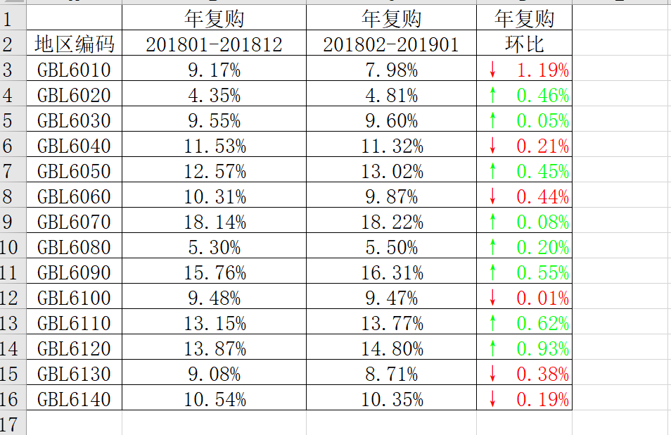 - 复购率 = 一年内消费次数大于等于2次的人数 / 全部人数