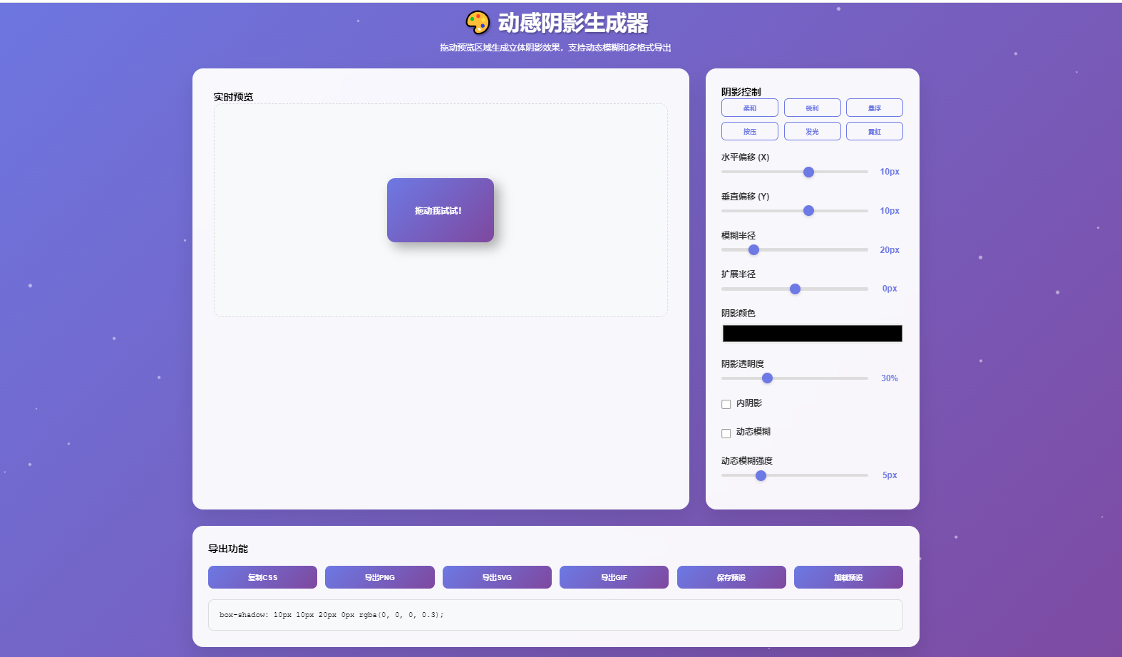 动感阴影生成器, 拖动生成 box-shadow 效果,实时预览按钮或卡片立体感。