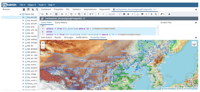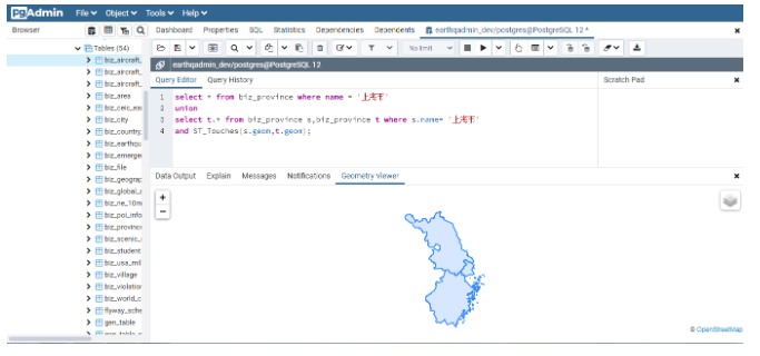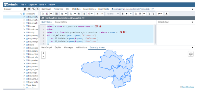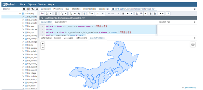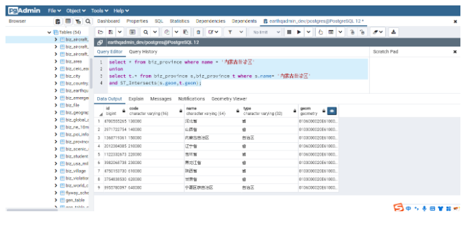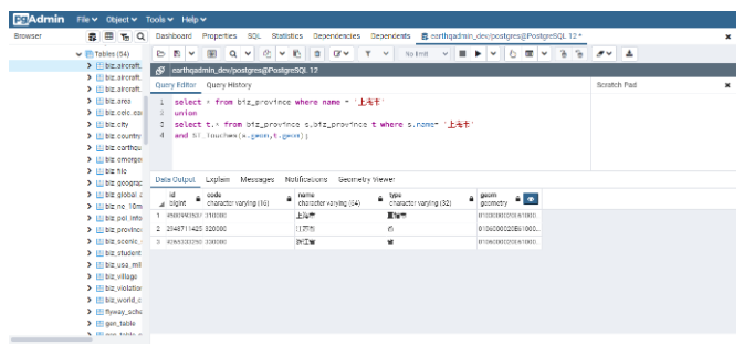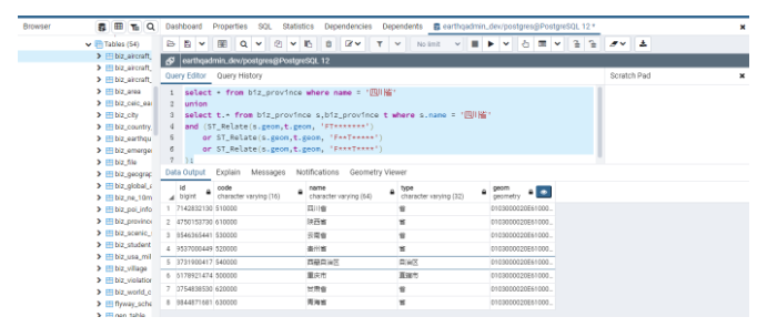 需要说明的是,为了能展示当前省份的信息,因此使用Union查询将本省的信息进行合并。同时为了可以直接看到查询结果,这里以PgAdmin终端为例,展示查询的结果: