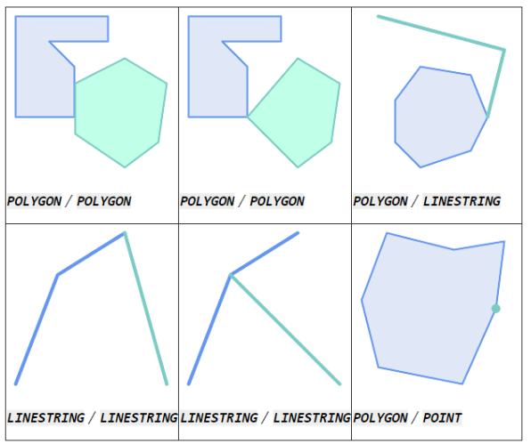简单的来介绍这个函数就是,函数允许测试和评估两个几何图形之间的空间(拓扑)关系,如维度扩展 九交模型 (DE-9IM) 所定义。DE-9IM 被指定为 9 元素矩阵,指示两个几何图形的内部、边界和外部之间相交的维度。 它由使用符号“F”、“0”、“1”、“2”的 9 个字符文本字符串表示(例如“FF1FF0102”)。可以通过将相交矩阵与相交矩阵模式进行匹配来测试特定类型的空间关系。 模式可以包含附加符号“T”(表示“交集非空”)和“*”(表示“任何值”)。 常见空间关系由命名函数 ST_Contains、ST_ContainsProperly、ST_Covers、ST_CoveredBy、ST_Crosses、ST_Disjoint、ST_Equals、ST_Intersects、ST_Overlaps、ST_Touches和 ST_Within 提供。 使用显式模式可以一步测试相交、交叉等多种条件。 它还允许测试没有命名空间关系函数的空间关系。 例如,关系“Interior-Intersects”具有 DE-9IM 模式 T********,该模式不由任何命名谓词求值。