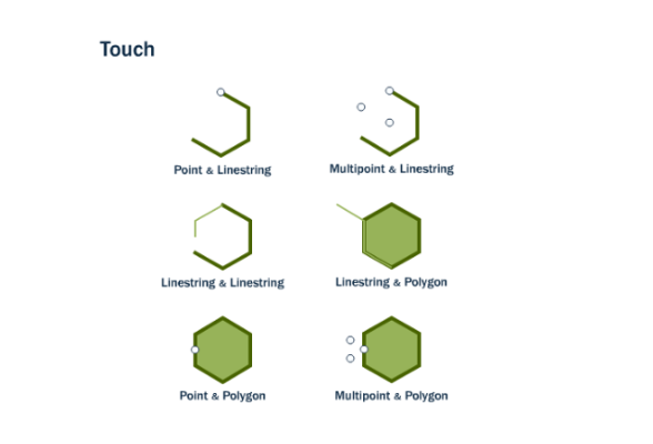 用于判断两个几何对象是否相邻,但不重叠。例如,判断两个多边形是否仅在边界上接触。
