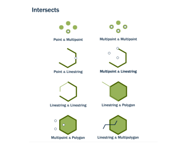 包括边界和内部的相交,只要两个几何对象有重叠或接触的部分,就会返回