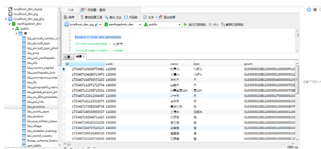这里将存储我国所有的省份信息,在navicat或者pgadmin中执行以下的查询条件可以看到以下返回结果集: