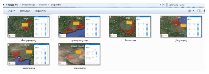 俗话说,巧妇难为无米之炊。在介绍数据的合成之前,首先我们需要准备几张待合成的截图。这里以省域的空间分析截图,在截图的时候在截图的中间标记了对应的省份名称。为了方便在进行合成时的效果观察,我们将对照片的名称取其中文汉语拼音全拼。这里准备的省份数据为:重庆市、广东省、湖南省、江苏省、辽宁省和维吾尔自治区六个省份或自治区。数据保存在具体的文件夹中,如下图所示:
