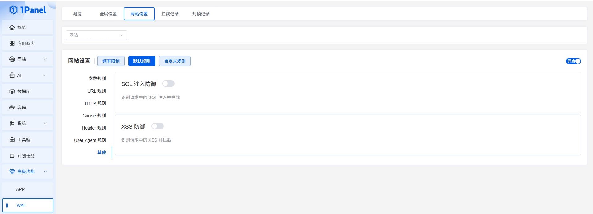 - 默认规则-其他-SQL 注入防御,XSS 防御 => 关闭