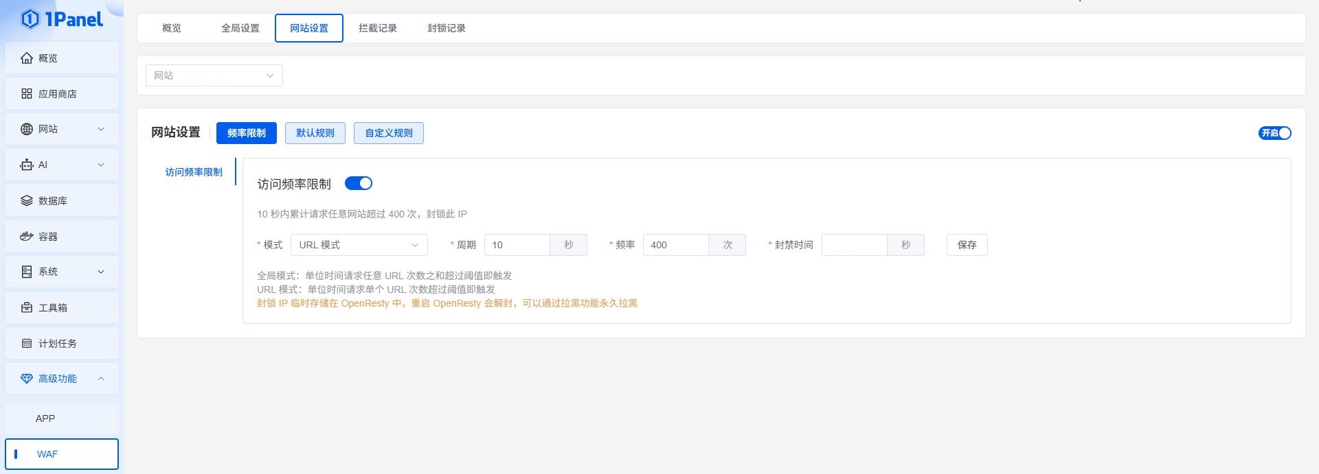 1.WAF 中的“网站设置”和“全局设置”需要同时开启才生效。