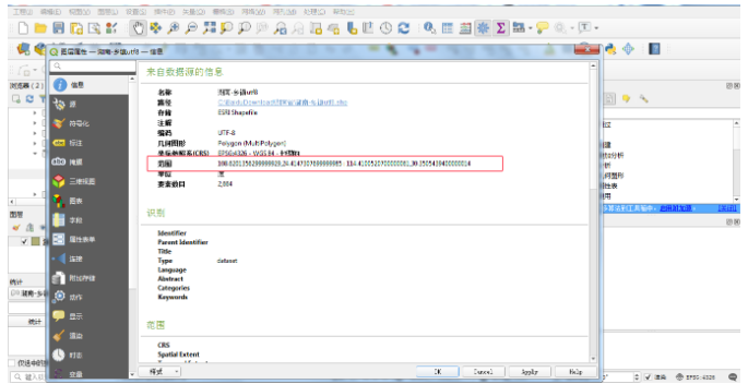 在以上的代码中就包含了两个关键的信息。第一个就是bbox_usa,这表示漂亮国的Bbox值,也就是Bounds边界信息。 关于Bounds,可以使用Qgis或者Arcgis等软件进行获取,以Qgis为例,当我们打开一份shapefile矢量数据之后,右键属性可以看到数据的Bounds值,如下图所示: