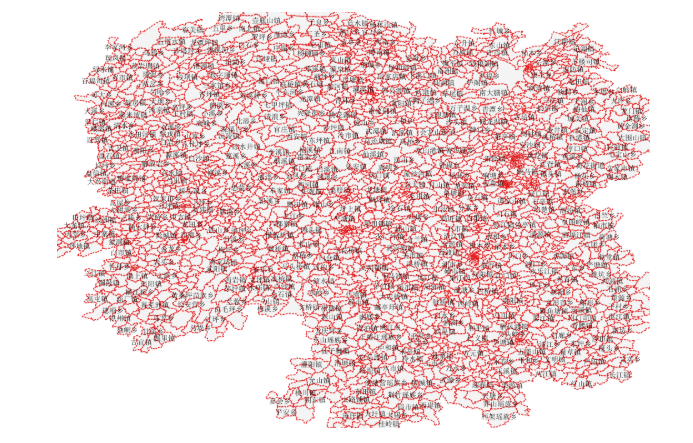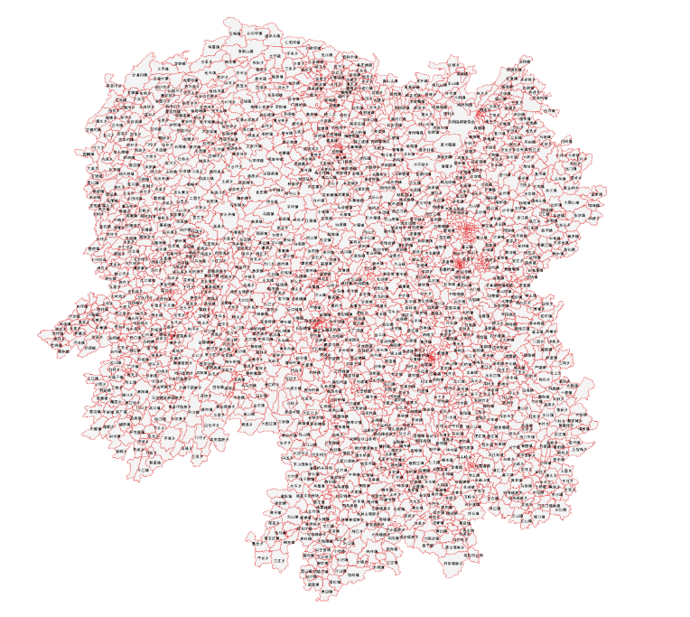 关于专题图的高度和宽度比例不协调的原因其实跟边界范围差不多,但是又存在一定的差异即边界值使用qgis获取的值是非常固定的,但是生成的专题图的高度和宽度是我们通过硬编码的方式指定的,因此具体的比例与原始的数据无法实现对应,从而导致将数据渲染到图片后,整体效果是失真的,即比例非常不协调,比如在指定宽度和高度为:1068*749的设置下,湖南省的乡镇区划专题图效果如下: