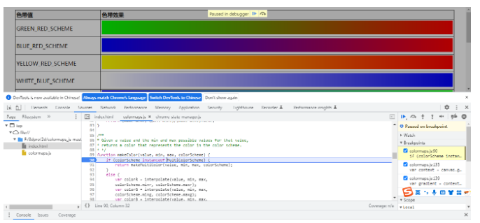 最后我们新建一个Html,在这个Html中将使用一个Table表格,然后在页面加载的时候,通过调用预制的色带对象来进行页面渲染,同时我们还演示了一个自定义的颜色区间生成。实例代码如下: