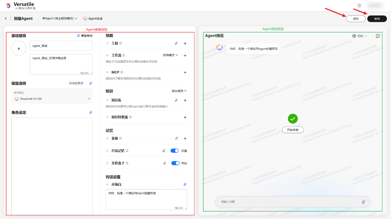 填写完成后,可在“Agent 预览” 区域实时查看效果,不满意随时调整,确认后点击“发布”。