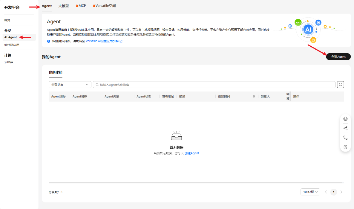 (1)在AI Agent界面,Agent页签,点击“创建Agent”按钮。