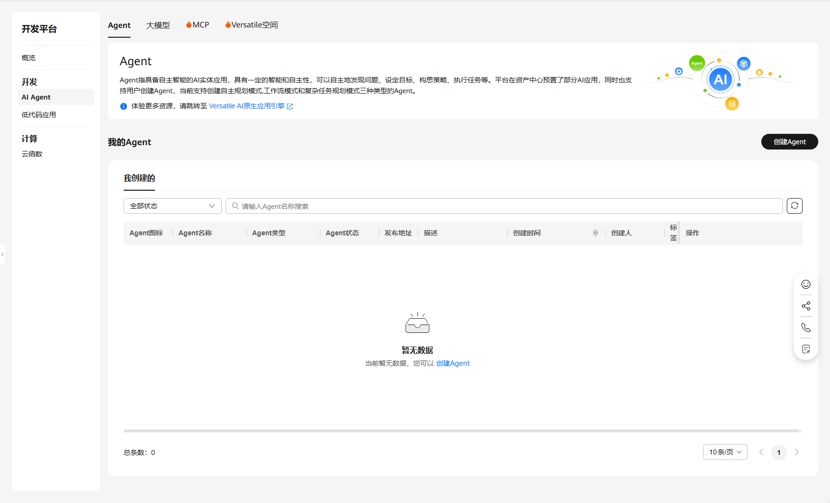 开通后即可进入功能界面,看到 “我的 Agent” 管理列表,此时可以开始创建了。