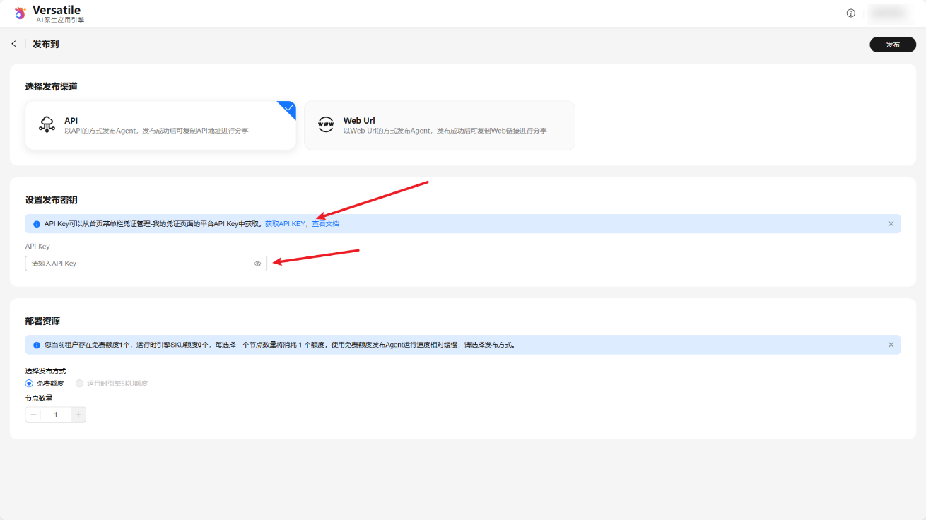 (4)发布过程中,需要可能需要配置API KEY,请按照帮助文档进行操作,创建完API KEY后,填入指定位置,之都点击“发布”(此过程大概需要一两分钟)。