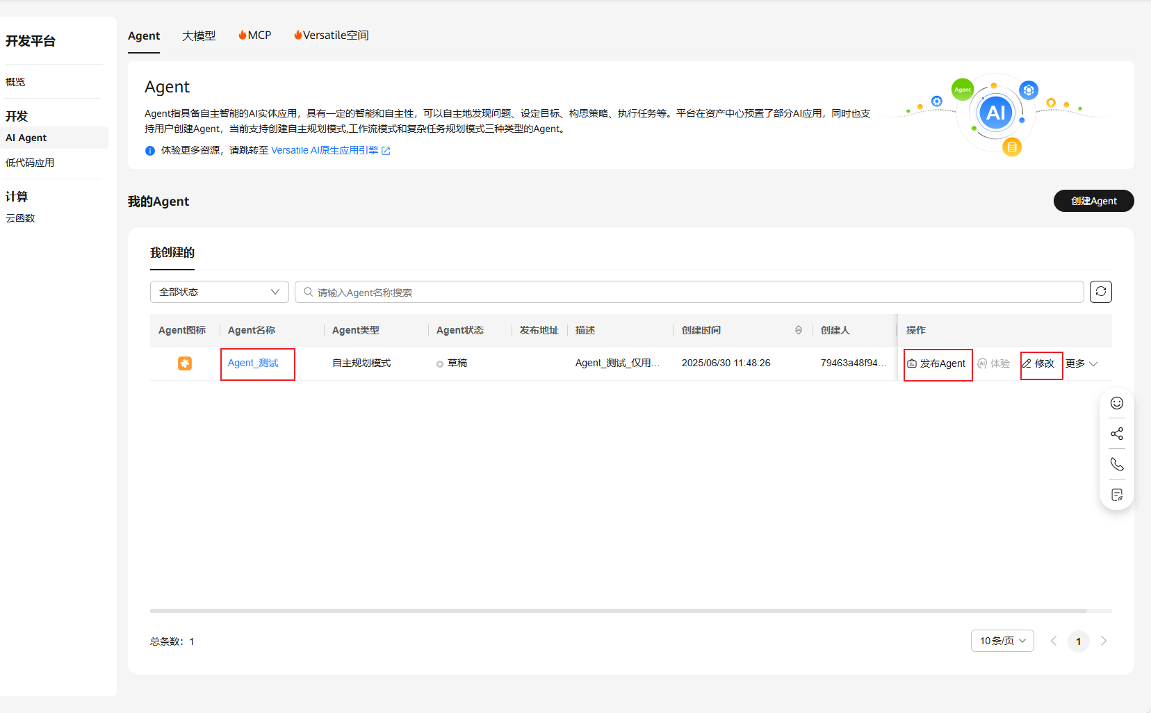 (6)如果创建的Agent之前并未发布,在完成保存后是作为草稿,可在Agent列表看到刚刚创建的个人Agent,在列表可对Agent进行查看、修改、发布、删除等操作。