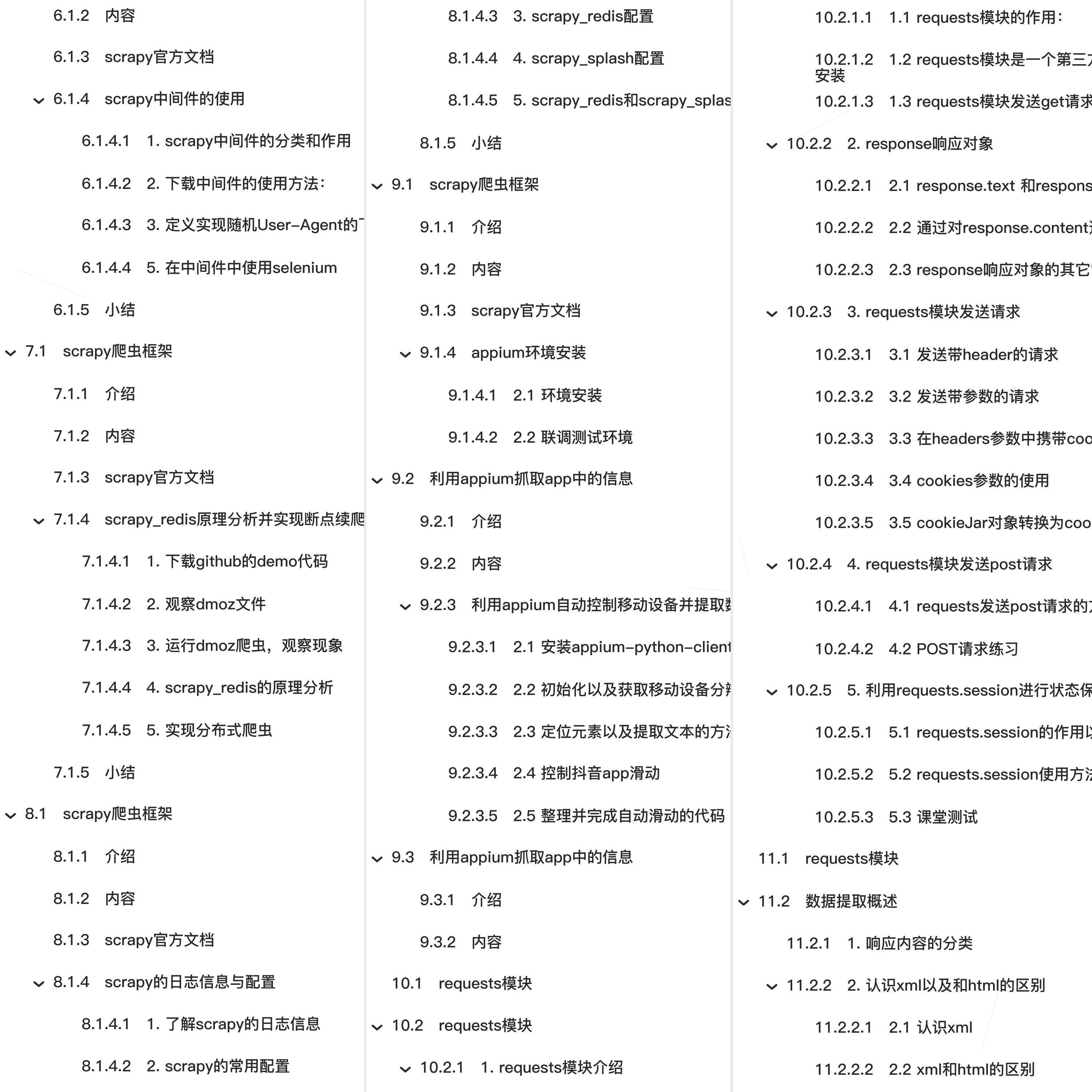 教程总体简介:爬虫基础、Mongodb数据库、scrapy爬虫框架、利用appium抓取app中的信息、requests模块、数据提取概述、数据提取-jsonpath模块、数据提取概要、数据提取-lxml模块、获取当前标签页的全部cookie信息、把cookie转化为字典、删除所有的cookie、显式等待、参数20表示最长等待20秒、参数0.5表示0.5秒检查一次规定的标签是否存在、EC.presence_of_element_located((By.LINK_TEXT, '好123')) 表示通过链接文本内容定位标签、每0.5秒一次检查、通过链接文本内容定位标签是否存在、如果存在就向下继续执行、如果不存在、直到20秒上限就抛出异常、i = 0、while True:、options.set_headles() # 无界面模式的另外一种开启方式、反爬与反反爬