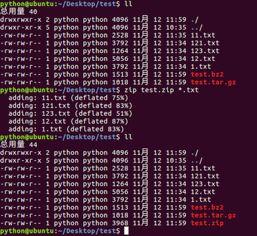 - 使用zip命令压缩的文件占用空间比较多, 当时比较通用,操作更加简单。