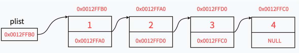 图中指针变量plist保存的是第⼀个节点的地址,我们称plist此时“指向”第⼀个节点,如果我们希望plist“指向”第⼆个节点时,只需要修改plist保存的内容为0x0012FFA0。