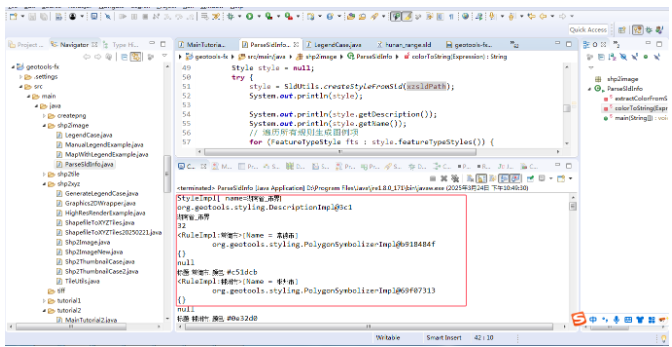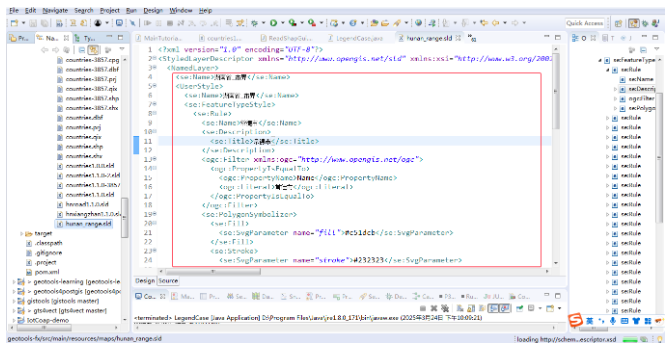 以上就是在Java中使用Geotools来读取SLD文件,自动解析其Rule信息来提取中文描述和标绘颜色信息的主要流程。下面将集合工程代码来进行讲解。