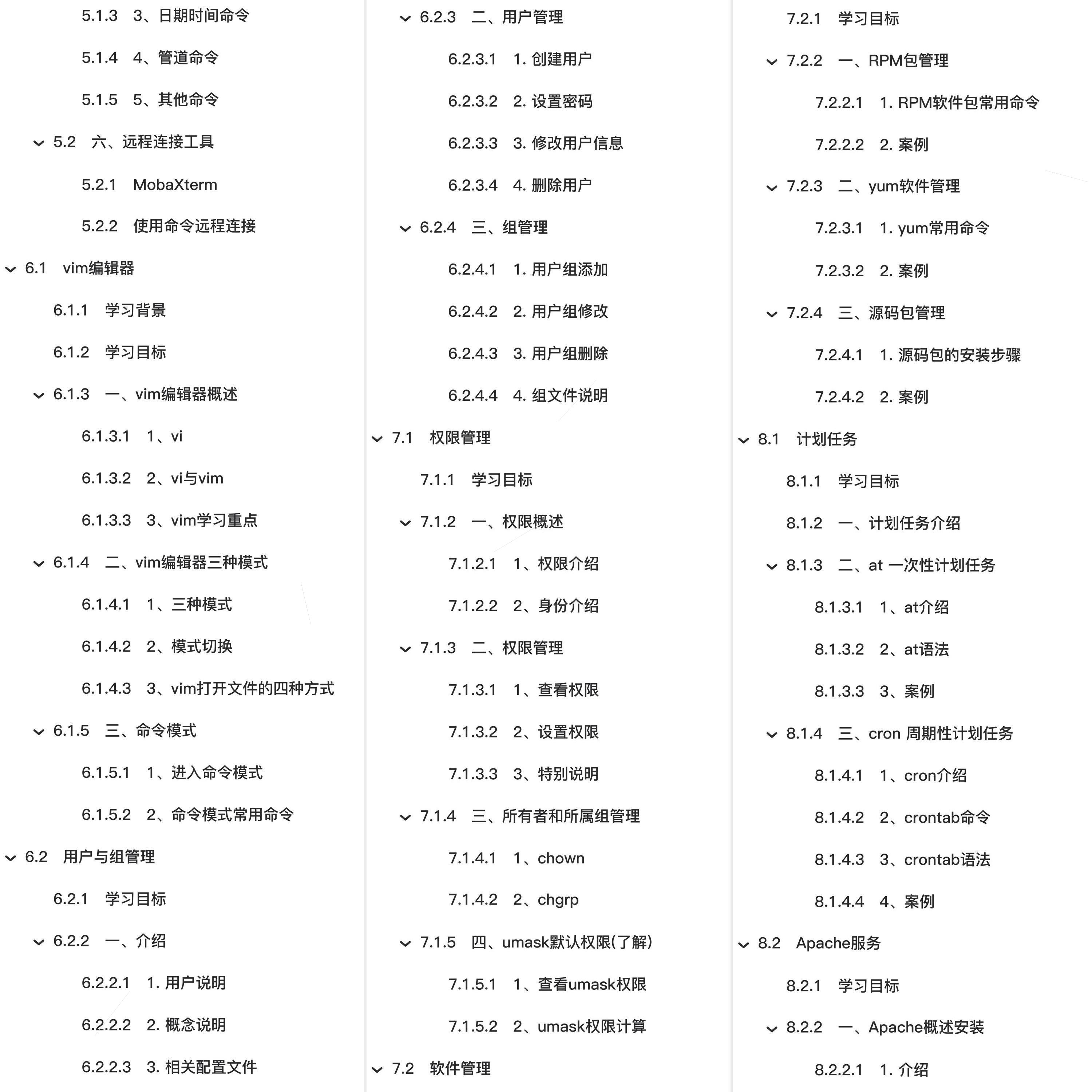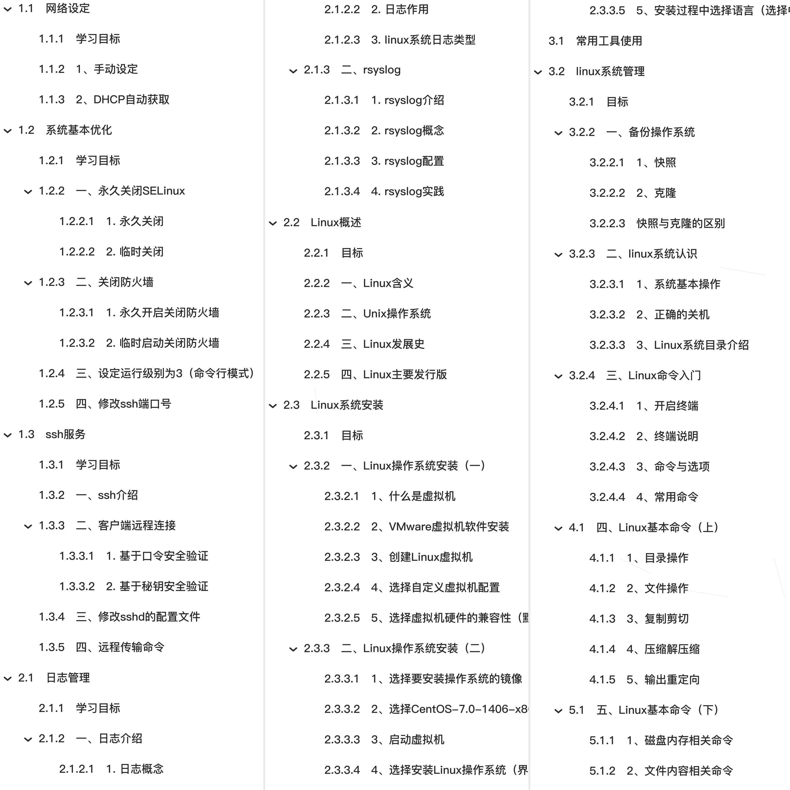 教程总体简介:网络设定、学习目标、1、手动设定、2、DHCP自动获取、系统基本优化、一、永久关闭SELinux、二、关闭防火墙、三、设定运行级别为3(命令行模式)、四、修改ssh端口号、ssh服务、ssh介绍、客户端远程连接、修改sshd的配置文件、远程传输命令、日志管理、日志介绍、rsyslog、Linux概述、目标、Linux含义、Unix操作系统、Linux发展史、Linux主要发行版、五、Linux应用领域、六、Linux系统特点、Linux系统安装、Linux操作系统安装(一)、Linux操作系统安装(二)、常用工具使用、linux系统管理、备份操作系统、linux系统认识、Linux命令入门、Linux基本命令(上)、Linux基本命令(下)、远程连接工具、vim编辑器、学习背景、vim编辑器概述、vim编辑器三种模式、命令模式、末行模式、编辑模式、实用功能、七、vim案例、用户与组管理、介绍、用户管理、组管理、权限管理、权限概述、所有者和所属组管理、umask默认权限(了解)、软件管理、RPM包管理、yum软件管理、源码包管理、计划任务、计划任务介绍、at 一次性计划任务、cron 周期性计划任务、Apache服务、Apache概述安装、apache配置详解及实践、虚拟主机配置、rewrite重写、apache日志切割、apache防盗链